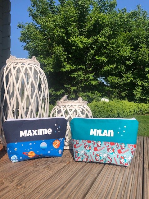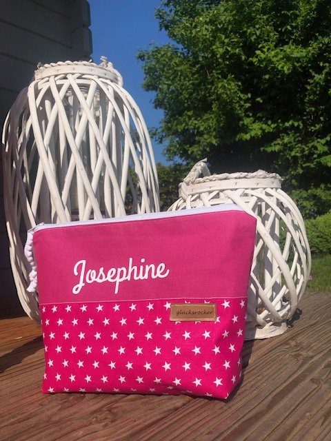Natürlich nähe ich Dir auch einen Kulturbeutel mit individuellem Schriftzug und Stoff nach Wahl.